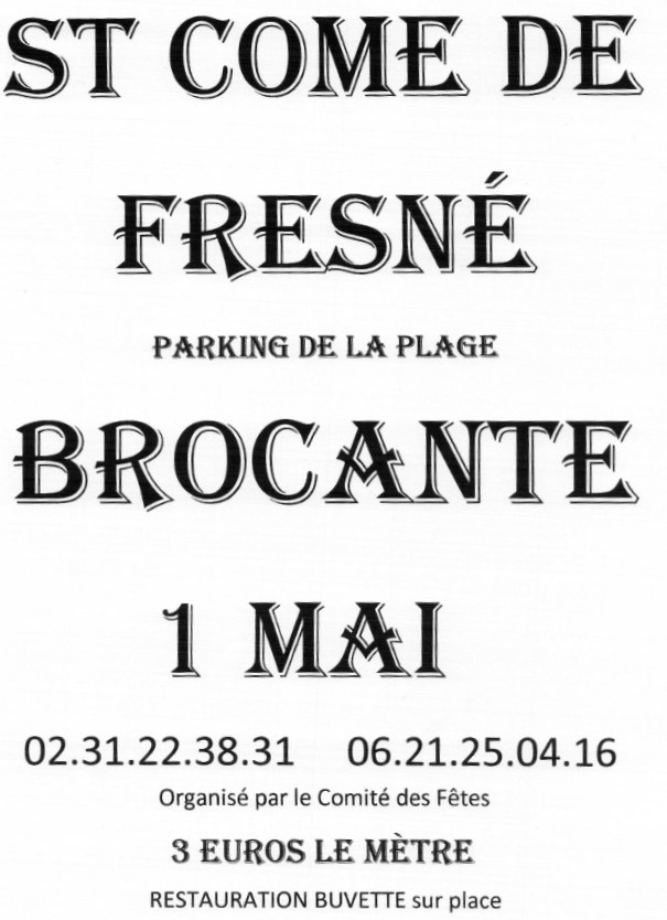 Le Comité des Fêtes de Saint-Côme-de-Fresné organise une brocante le 1er mai, sur le parking de la plage.